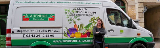 Katrin Leipacher steht vor dem neuen Abokisten-Transporter. Jetzt kommt das Auenhof-Gemüse noch frischer zu euch nach Hause, denn unser neuer Transporter besitzt eine Kühlanlage!