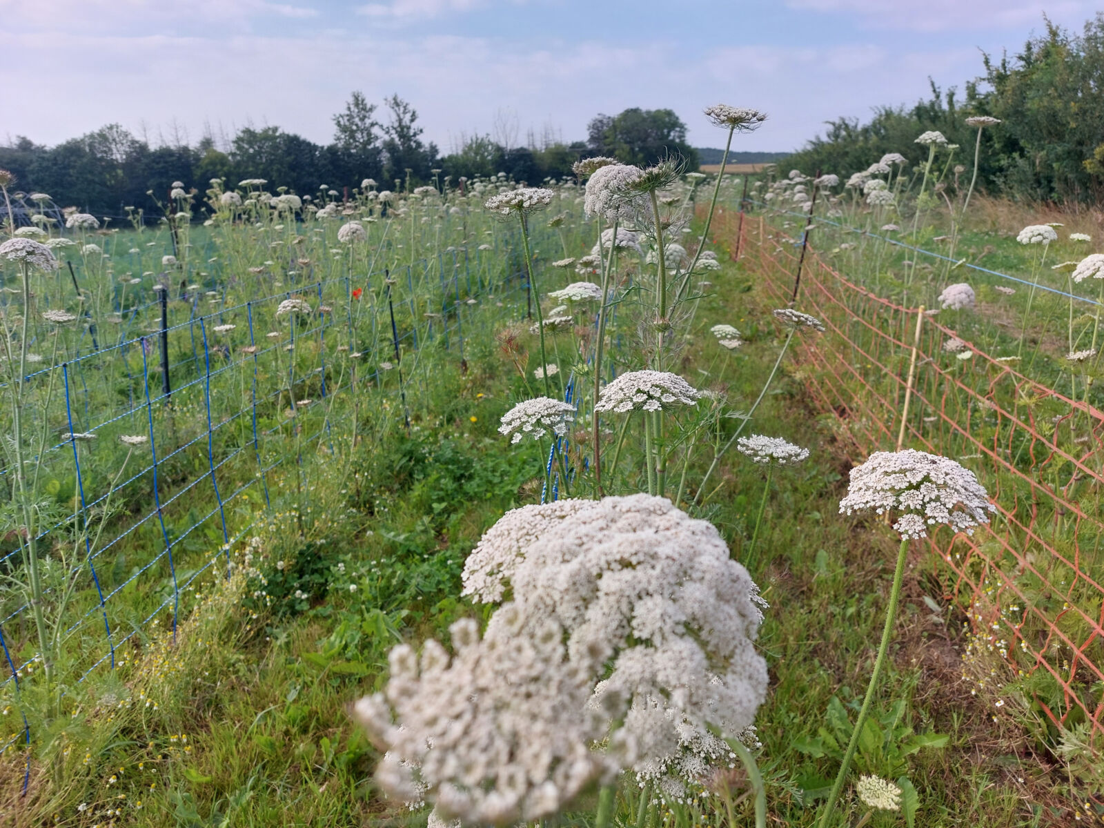 Wie auch schon in den letzten Jahren vermehren wir Möhrensaatgut für Bingenheim. Das ist eine ganz besondere Aufgabe für uns: denn der Anfang von unserem Tun ist das Saatgut. Die Jungpflanzen für das Möhrensaatgut ziehen wir selber an. Dann werden die kleinen Pflänzchen im Herbst gepflanzt. Inzwischen haben die Pflanzen schon eine gewisse Größe erreicht. Damit sie nicht umknicken, haben wir ein Spalier neben die Pflanzen gebaut. Sie werden daran festgebunden und können so gestärkt weiter pflanzen. Bis zur Ernte brauchen sie allerdings noch ein Weilchen.