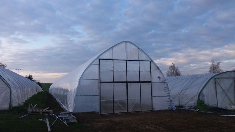Nachdem im Januar der Sturm Fredericke einen großen Anteil unserer Folientunnel zerstört hat, haben wir nun den Aufbau des ersten Folientunnel fertig gestellt. Der Typ "Ostrau" wurde von Oliver Leipacher selber entworfen. Die gotische Form soll dazu führen, das der Schnee herunter rutschen kann. Extra Verstrebungen sollen helfen, das Stürme dem Gewächshaus nichs anhaben können. Wir hoffen das Beste!