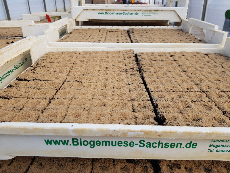 Nun sind die ersten Sätze Gemüse ausgesät. Die kleinen Saatkörner werden in die maschiniell vorgestanzten Erdpresstöpfe eingelegt. Ausgesät ist Gemüse wie Kohlrabi, Fenchel, Zwiebel, Mangold, Spinat, Salat und vieles mehr. Bald können die zarten Pflanzen gepflanzt werden.