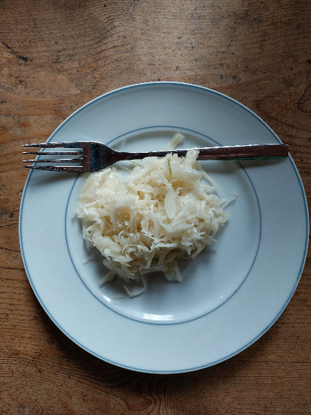 Letztes Jahr haben wir begonnen mit einem regionalen Subunternehmer eigenes Sauerkraut und Krautsalate herzustellen. Alles in feinster Bioqualität. Und wir können versichern: es ist köstlich! Köstlich und gesund. Wir freuen uns auch sehr, daß wir so die Möglichkeit haben unsere "B-Ware" vermarkten zu können und das nicht so viel auf dem Kompost landet. Probieren Sie doch einfach mal. Guten Appetit.