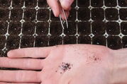 Fast alles unser Gemüse kommt aus unserer eigenen Jundpflanzenproduktion. Die Anbauplanung für unser Gemüse wird im Herbst des Vorjahres gemacht, da wir mit der Jungpflanzenproduktion schon Ende Januar beginnen. Und bis dahin muss ja das Saatgut bezogen sein. Unser Saatgut beziehen wir zu einem großen Teil von Bingenheim. DIe Saat wird endweder manuell ausgebracht oder üer eine Erdpresstopfmaschiene. Nachdem die "Pflanzen" einige Tage in der Keimzelle verbracht haben (sehr warmer Bereich), schaut schon schnell das erste Grün heraus.