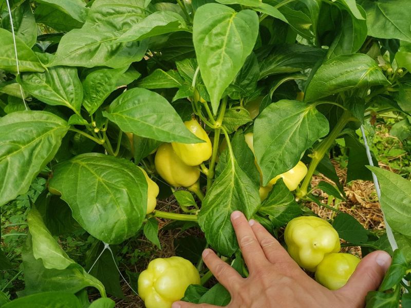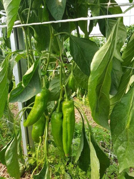 Dieses Jahr haben wir viele Paprikasorten sowohl im Gewächshaus, als auch im Freiland angebaut. Die Sorten sind Blockpaprika, Spitzpaprika, Bratpaprika und auch viele Peperonisorten. Momentan sind die Paprika noch gelb und grün. Sie reifen aber wunderbar bei Wärme und Sonne. Bald werden sie rot, orange oder auch schokoladenfarbig. Damit die Paprikapflanzen nicht umknicken, werden sie an einer Art Zaun angeleitet.