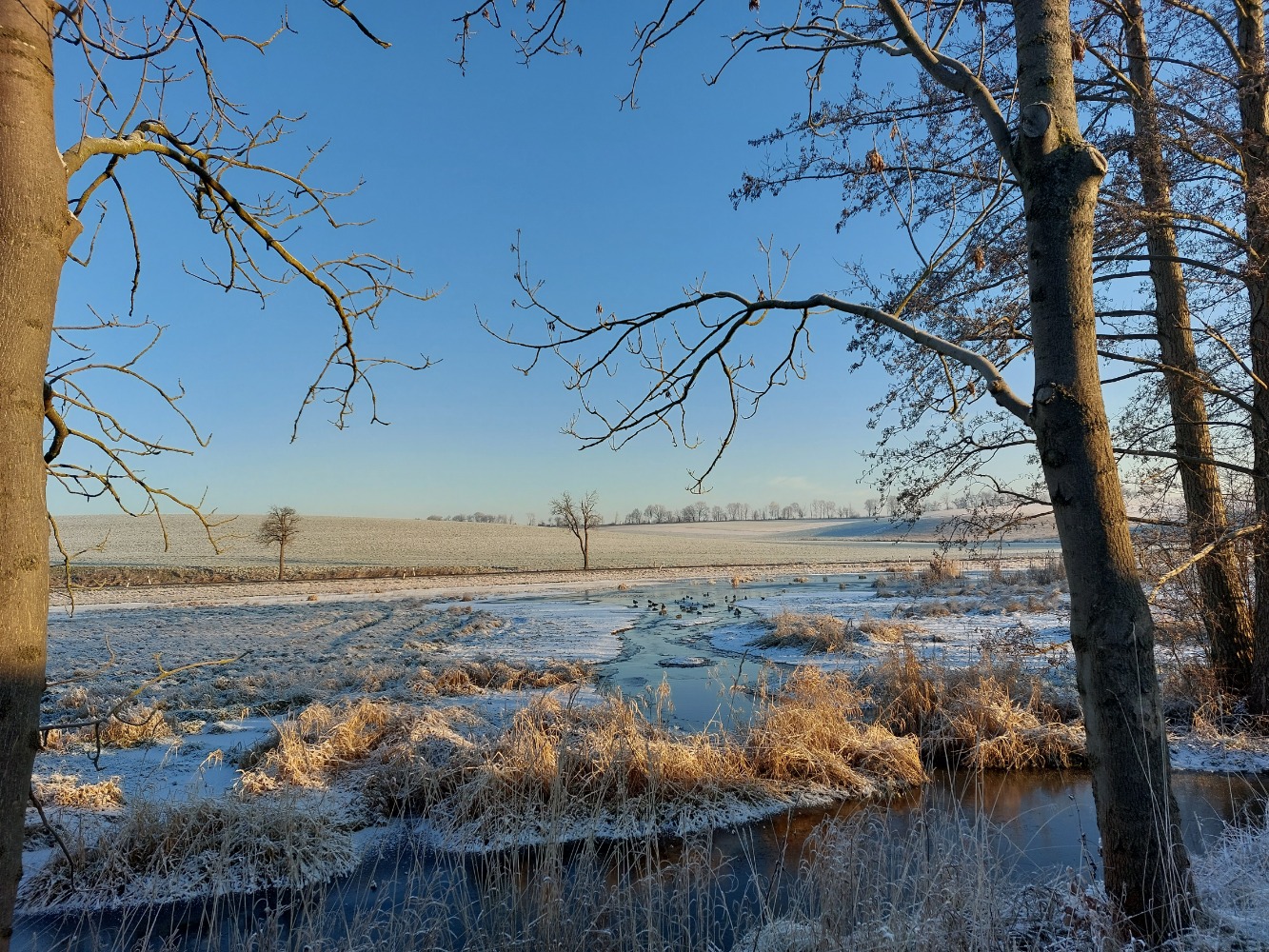 Der Biber hat zahlreiche Staudämme entlang der Jahna gebaut. Vor allem entlang unserer Anbauflächen. Es ist eine wunderschöne Seenlandschaft entstanden. Hier haben sich zahlreiche, seltene und geschützte Tiere angesiedelt. Zum Beispiel ist hier auch der Eisvogel zu Hause. Es ein seltenes Feuchtgebiet in unserer Gegend.