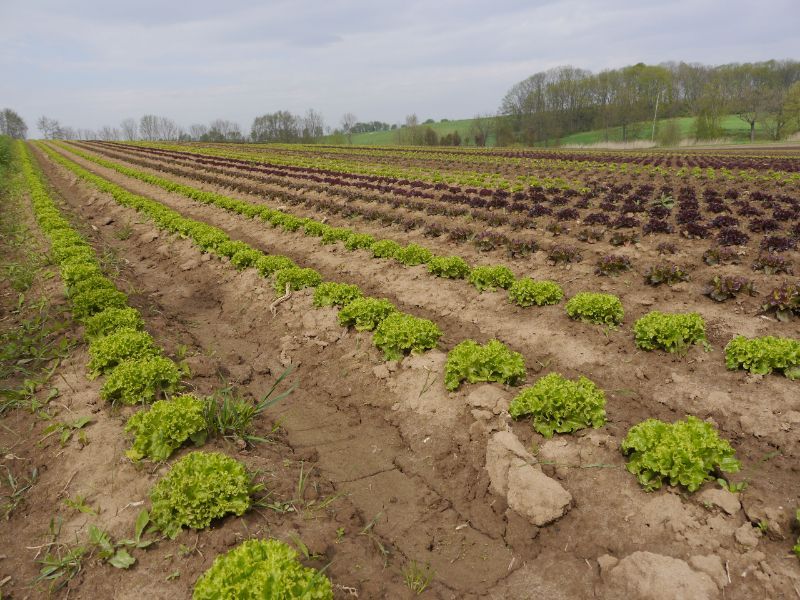 Vor einem Monat haben wir begonnen, ins Freiland zu pflanzen. Endlich hat es die letzten Tage etwas geregnet. Der Regen und die Wärme haben den Pflanzen einen guten Start zum Wachsen gegeben. Die letzten Salate werden noch aus den Folientunneln geerntet, dann beginnen wir mit dem Freilandsalat. Trotzdem reicht der Regen nicht. Schon längst haben wir unsere Bewässerung wieder aufgebaut. Der Boden ist nur oberflächlich etwas feucht.